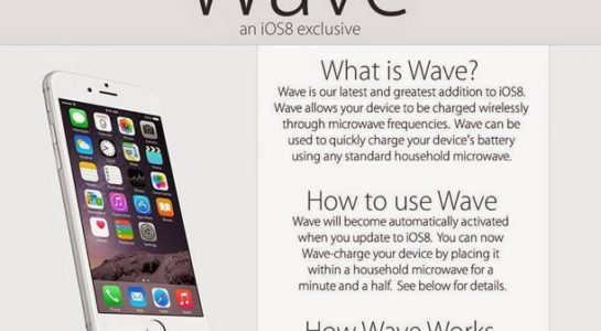 Podobne ako pred rokom, aj tentoraz si internetoví anonymovia vystrelili z užívateľov iPhone nemilým spôsobom. Tento rok však na to išli vtipálci trochu inak a po novom zverejnili celkom dôveryhodne vyzerajúcu brožúru, ktorá informuje užívateľov iPhone o tom, že keď aktualizujú na operačný systém iOS 8, získajú tak možnosť nabíjania telefónu pomocou mikrovlnného žiarenia, ktoré sa nenachádza nikde inde, než v našich mikrovlnkách. Vtip, ktorý sa zrodil v USA, už za tento víkend stihol získať prvé obete, respektíve prvé zničené iPhony.