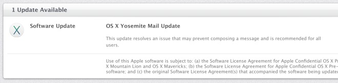 Apple dnes aktualizoval aplikáciu Mail pre OS X Yosemite. Táto samostatná aktualizácia má riešiť problém týkajúci sa tvorby správ na počítačoch s OS X Yosemite. Je však zaujímavé, že Apple vydal separátny update pre aplikáciu, ktorá je súčasťou Developer Preview a nie finálnej verzie systému.