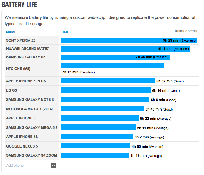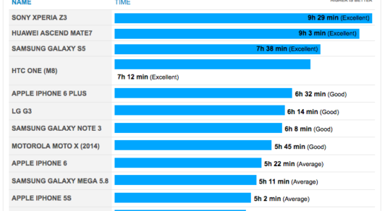 Vítězem testu Phonearena se totiž stala Sony Xperia Z3, která disponuje baterií s kapacitou 3100 mAh a při testu vydržela 9 hodin a 29 minut. Rozdíl mezi kapacitou baterie iPhone 6 Plus a Xperia Z3 je tedy pouhých 185 mAh a přesto je výdrž Xperia Z3 o neuvěřitelné tři hodiny delší! Rozdíl mezi iPhone 6 a iPhone 6 Plus je 1105 mAh a ve výsledku větší iPhone 6 vydrží fungovat jen o 70 minut déle než menší model. Xperia má navíc jen o 0,3″ menší displej než iPhone 6 Plus a disponuje ještě hustějším displejem než iPhone. Pokud jste si pak stěžovali na výdrž baterie u iPhone 5s a těšili se, že iPhone 6 vše změní, pak ano, změnil, získáte s ním o 20 minut delší výdrž baterie.