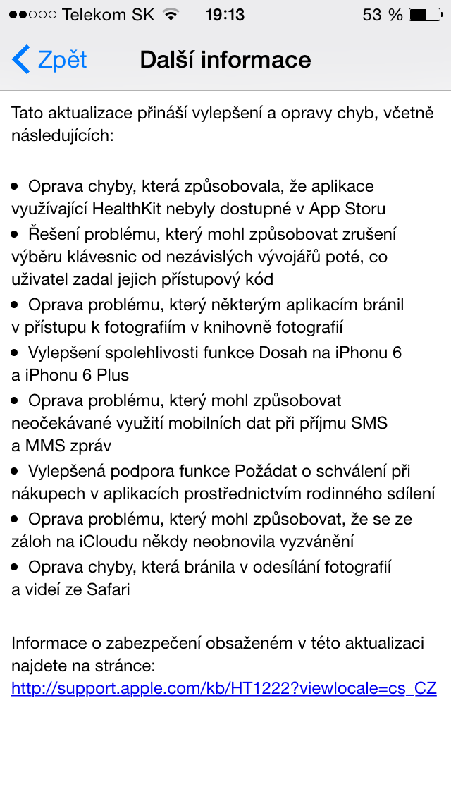 No, mně to aktualizaci nabídlo, stáhlo, ale nedaří se mi jí nainstalovat. Hází mi to chybu: „Aktualizaci nelze ověřit. Položku iOS 8.0.1 nelze ověřit, protože nejste připojeni k internetu.“ A přitom mám zaplou Wi-Fi :-/ Přes iTunes mi to aktualizaci nenachází, tak si z netu stahuji iOS 8.0.1 Restore.ipsw pro můj iPhone 5, tak uvidíme, zdali se mi pak podaří aktualizovat přes iTunes…