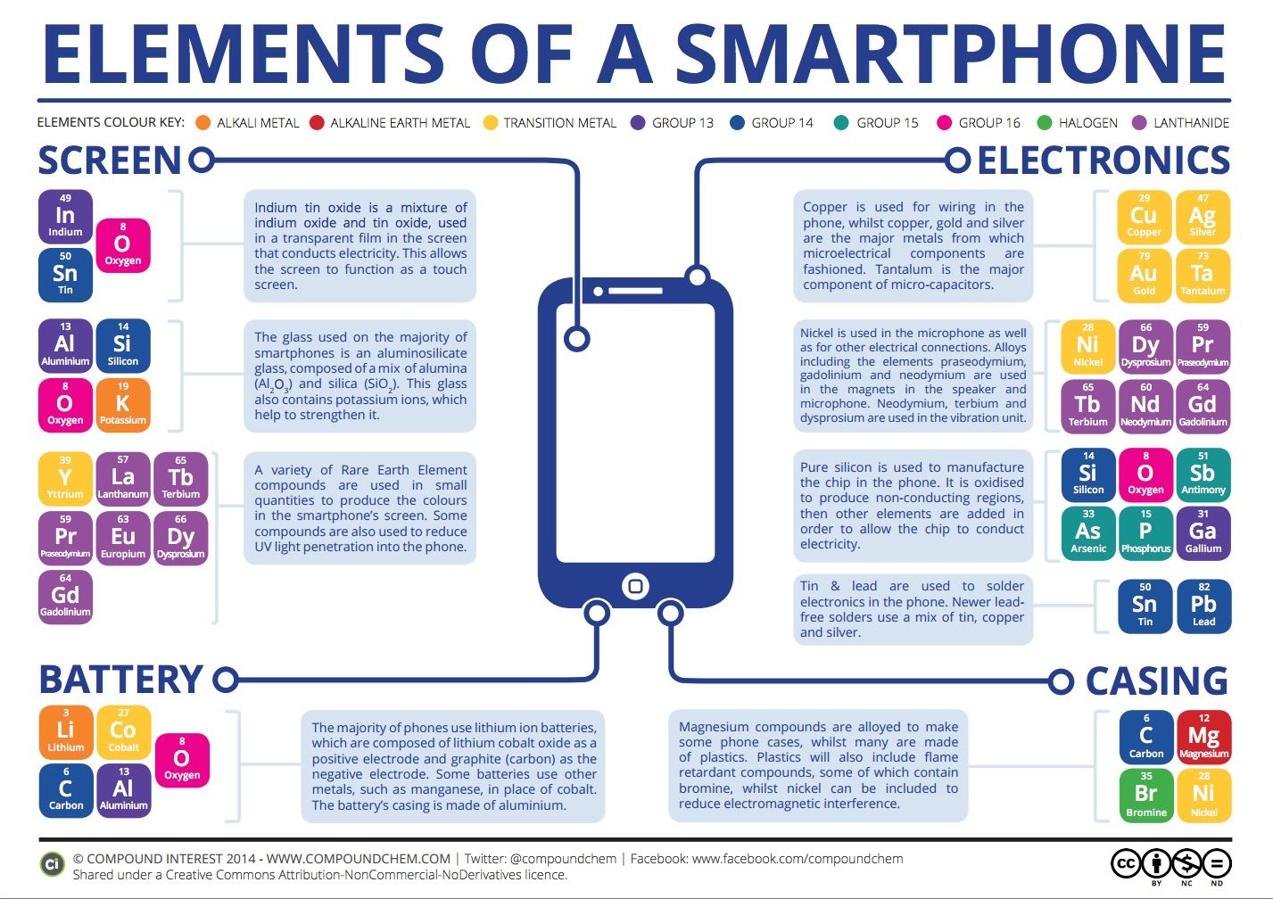 Keď sa pozriete na telefón iPhone zvonku, vidíte v ňom len zhluk tvrdeného skla, zafíru, hliníku a plastu. Keď by ste však dali iPhone do ruky chemikovi, zistíte, že vo vašich vreckách sa nachádza hotová chemická tabuľka prvkov. Nepočítame pritom len materiály, z ktorých sú jednotlivé súčasti iPhone vyrobené, ale počítame tu aj chemické prvky, ktoré napríklad dávajú vášmu telefónu život a živia ho do momentu, než ho zase dáte na nabíjačku – a tu začne dochádzať k novým chemickým reakciám.