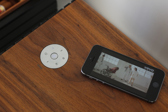 Vrchní strana reproduktoru nabízí dvojici podsvícených kruhových ovladačů a zatím co na levém přepínáte zdroje zvuku, na pravém otáčením, na které jste zvyklí z klasického iPodu měníte hlasitost. Co zamrzí je absence dálkového ovládání, to sice můžete nahradit pomocí aplikace JBL MusicFlow, která je zdarma, ovšem i tak bych si u tohoto povedeného kousku představoval malý a designově podobný dálkový ovladač. Veškeré ovládání tak probíhá buď pomocí aplikace ve vašem iOS nebo Android zařízení a nebo přímo na těle reproduktoru. Osobně si myslím, že aplikace JBL MusicFlow má před sebou ještě dlouhou cestu k dokonalosti a je to poměrně velká škoda, protože pomocí aplikace můžete například nastavit eqvalizér a další detaily svého reproduktoru, vše je však poměrně těžkopádné a aplikace si určitě zaslouží ještě nějaký ten update. Kromě toho, že bych u reproduktoru uvítal dálkové ovládání není designu co vytknout a mohu se pouze uklonit a sundat klobouk před mistrovským dílem, které vytvořili v JBL. Zajímavostí je také možnost sundat přední molitanovou mřížku a změnit tak vzhled celého reproduktoru tak, jak to můžete vidět na našich fotografiích.