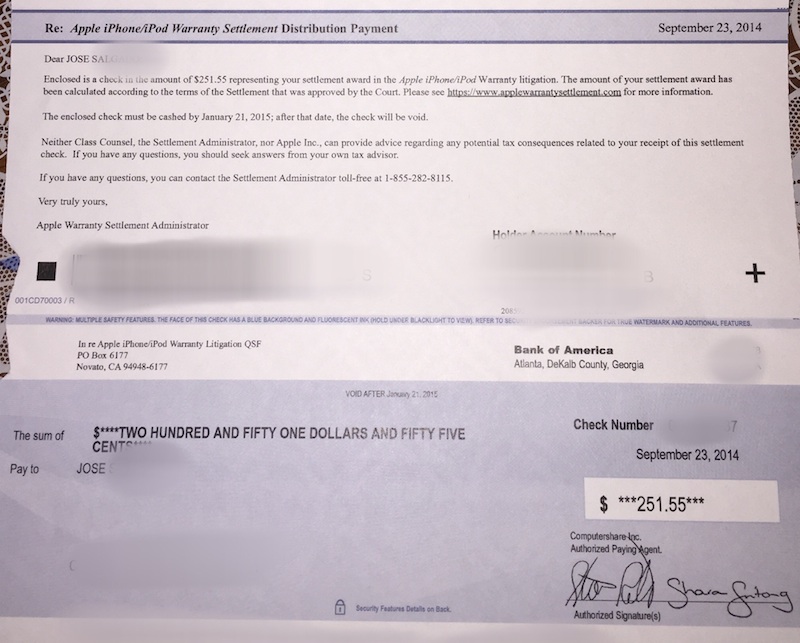 Několik majitelů iPhone obdrželo šek v hodnotě 251.55 $, což je v přepočtu 5477 kč, někteří ale obdrželi šeky v hodnotě až do 300 $ (6540 kč). Majitelé iPodů touch pochopitelně získali zpět menší částky. Všichni uživatelé mají čas do 21. ledna, do tohoto data si šeky musí buď proměnit za hotové peníze, nebo je vložit na účet.