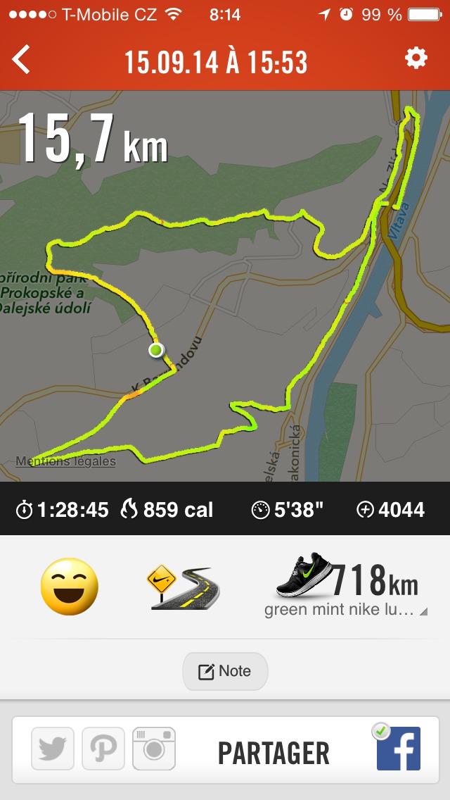 Já osobně oceňuju to, že si můžete nastavit automatické spuštění pauzy, když se zastavíte třeba, abyste si zavázali rozvázanou tkaničku nebo když vám někdo volá a vy se rozhodnete zvednout telefon. Jakmile doběhnete do cíle nebo třeba nedoběhnete a zinfarktujete cestou někde v lese a ukončíte běh, lze si k běhu přidat doplňující informace pro vás: jak jste se během výběhu cítili (pomocí smajlíků), v jakém terénu jste běželi (silnice, pláž, …), počasí (automaticky), v jakých teniskách jste běželi a samozřejmě můžete nahrát fotku, co jste pořídili během tréninku. No a ve finále, aby celej svět nebo alespoň vaši přátelé věděli, že jste se byli vyprdět při běhání, můžete to diky aplikaci Nike+ sdílet na Facebooku, Twitteru, Pathu nebo Instagramu. Sdílíte buď jen počet kilometrů, celou mapu výběhu nebo foto.