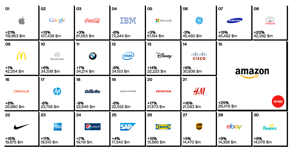 Apple si zachoval své prvenství a i letos je číslem jedna na seznamu Best Global Brands. Poprvé společnost s nakousnutým jablíčkem v logu stanula v čele tohoto seznamu v loňském roce, kdy překonala společně s Googlem dosavadního krále Coca-Colu a povedlo se ji to i letos. Hodnota společnosti, kterou založil Steve Jobs a Steve Wozniak je nyní 118,8 miliardy amerických dolarů, respektive hodnota značky jako takové. V loňském roce byla přitom hodnota značky Apple 98,3 miliardy amerických dolarů. Hodnota samotné značky nesouvisí s hodnotou společnosti nebo s jejím majetkem. V hodnotě značky je započteno mnoho faktorů, které tvoří hodnotu samotného brandu, loga společnosti a toho, co znamená daná značka pro spotřebitele.