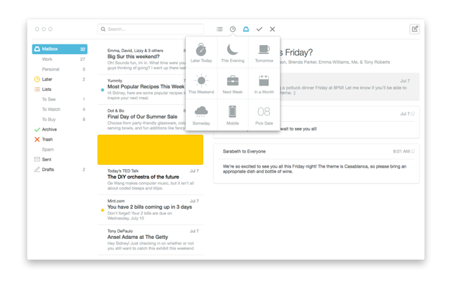 Největší výhodou Mailboxu oproti standardní aplikaci Mail pro Mac má být přítomnost gest, která známe z iOS verze aplikace. Na svém trackpadu nebo pomocí Magic Mouse máte možnost například mazat maily nebo je třídit pomocí jednoduchých gest a tím šetřit čas. Kromě vydání beta verze Mailboxu pro Mac, se v pondělí dočkala aktualizace také iOS verze, která tak postoupila na verzi Mailbox 2.3.1, jenž přináší optimalizaci pro iPhone 6 a iPhone 6 Plus a také úpravy pro iOS 8.