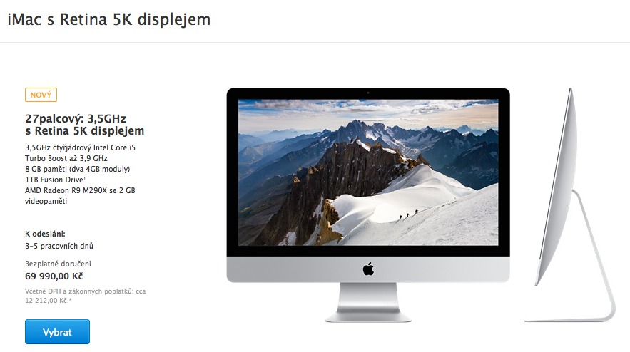 Nový iMac with retina display je prozatím dostupný jen ve 27″ verzi. Základní model nabízí procesor Intel Core i5 quad-core s frekvencí 3,5GHz a podporou Turbo Boost až do 3,9Ghz, 8GB RAM s frekvencí 1600Mhz a konfigurací 2x4GB RAM s tím, že celkově jsou v počítači k dispozici 4 sloty pro RAM moduly, 1TB Fusion disk a grafickou kartu AMD Radeon R9 M290X se 2GB videopaměti. Cena základního modelu je dle Apple.cz 69 990Kč a objednávat jej můžetej iž dnes s tím, že dostupný bude do 3-5 dnů.