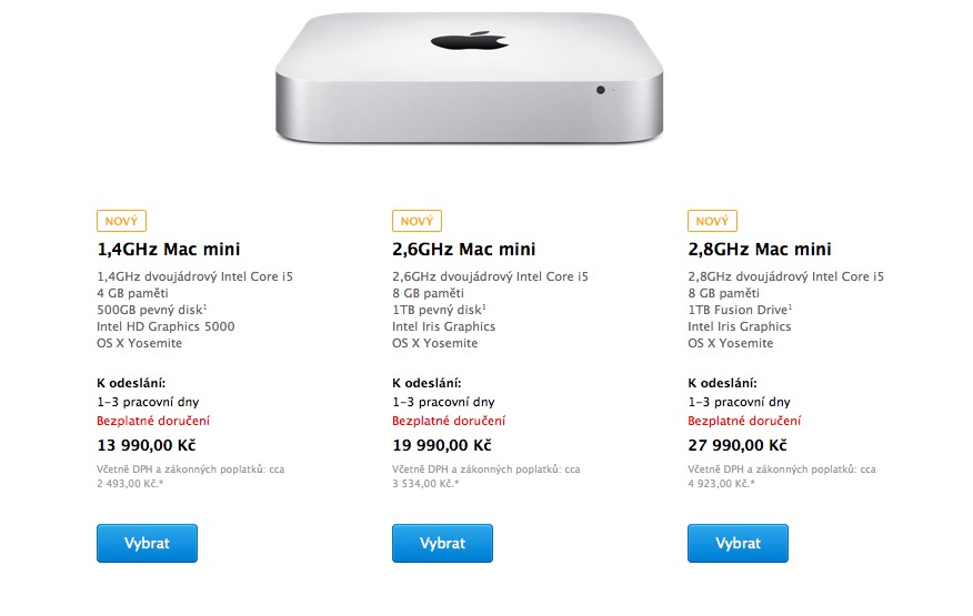 Mac mini je nyní levnější než doposud a v USA Apple snížil oficiální cenu z 599$ na 499$, což však u nás znamená, že za nový Mac mini v základní konfiguraci s 1,4 GHz procesorem dvojádrovým Intel Core i5, 4GB RAM, 5GB diskem a Intel HD Graphics 5000 zaplatíte 13 990Kč. Za nejvyšší model pak zaplatíte až 27 990Kč a nový Mac mini lze dále konfigurovat. Pokud však do Mac mini nacpete vše co lze, dostanete se na částku 58 990Kč.