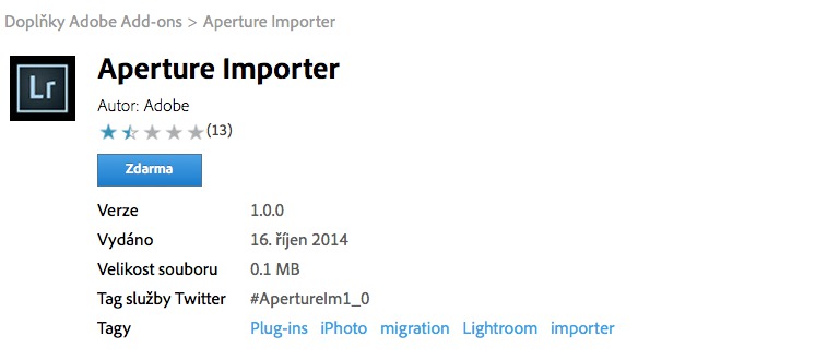Když se pak na hodnocení podíváte podrobněji, zjistíte, že Aperture Importer je určen pouze pro členy Creative Cloud a ostatní jej nemohou využít a i členové Creative cloud si stěžují na to, že se aplikace neinstaluje přímo tak, jako všechny ostatní, ale stahuje se z webu Adobe. Samotná funkce by však měla být naprosto funkční a postkytuje přenesení následujících prvků z Aperture do Lightroom: Star Ratings, Keywords, GPS Data, Rejects, Hidden Files, Color Labels, Stacks, Face Tags.
