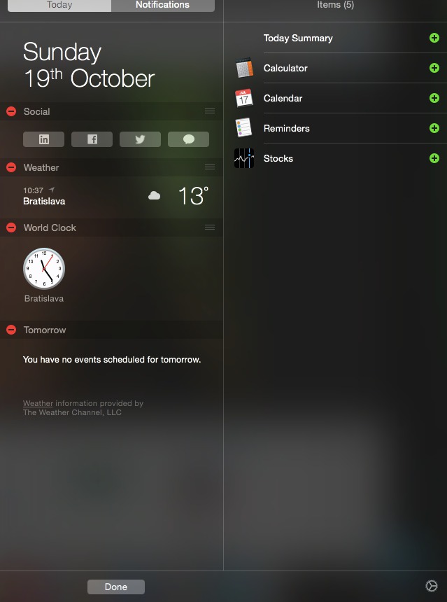 Widgety pro notifikační centrum jsou v podstatě naprosto stejné jako ty, které máme pro iOS 8. Více než nějaké funkce typu kalkulačky totiž přináší přehledy o počasí, sociálních sítích a tak dále. Součástí OS X Yosemite je několik widgetů a další si můžete stáhnout z Mac App Store.
