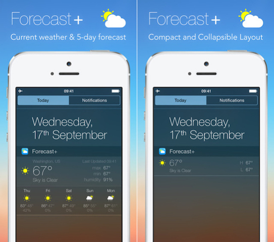 Podle této aplikace byste měli zapomenout na nudné nativní zobrazení informací ohledně počasí v notifikačním centru. Forecast+ přichází s widgetem, který toho zobrazí opravdu hodně: momentální teplotu, polohu, vlhkost, předpoveď na dalších 5 dní či maximální a minimální teplotu.