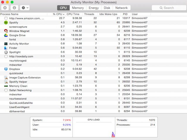 Možná uvidíte, jak vám stránka v Safari spotřebovává 95% CPU, čehož se zbavíte klasickým zavřením zmíněné stránky. Možná ale uvidíte i jiné aktivity, jako například mds nebo mdsworker, které běží pro to, aby zkontrolovaly hard disk. Tyto položky běží často po updatu systému nebo po prvním připojení externího zařízení k Macu. Nechte tyto aktivity bežet, jelikož jsou potřebné a po nějakém čase zmizí.