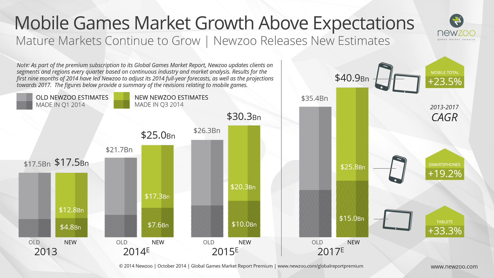 Společnost Newzoo zveřejnila nejnovější analýzu trhu mobilních aplikací a her, podle které by měly příjmy z mobilních her v letošním roce dosáhnout 25 miliard amerických dolarů. Z toho 7,6 miliard dolarů budou příjmy z tabletů a zbývajících 17,3 miliardy dolarů pak z chytrých telefonů. Jedná se o 42% nárůst oproti loňskému roku. Letošní nárůst a predikce pro příští rok pak znamenají, že mobilní hry již v příštím roce co se zisků týká překonají herní konzole.