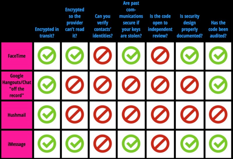 Skupina EFF sa najnovšie pozrela na úroveň zabezpečenia a bezpečnosti jednotlivých komunikačných aplikácií, ktoré sú dnes masovo využívané na smartfónoch. Pozrela sa tak na známe služby ako je Google Hangouts, Skype, Snapchat, BBM a ďalšie. Medzi službami nakoniec nechýbajú ani služby iMessage a FaceTime, čiže dve služby vytvorené spoločnosťou Apple. Najbezpečnejšia služba sa potom určila na základe 7 kritérií a to podľa toho, či sú správy v komunikácii šifrované, a ak áno, či sú šifrované tak, aby ich nevedel poskytovateľ služby prečítať, či sú správy v bezpečí v prípade, že dôjde k ukradnutiu kľúčov, či je kód služby sprístupnený, či je poskytnutá korektná dokumentácia modelu zabezpečenia, či bol kód overený a nakoniec, či je možné overiť identitu kontaktov.