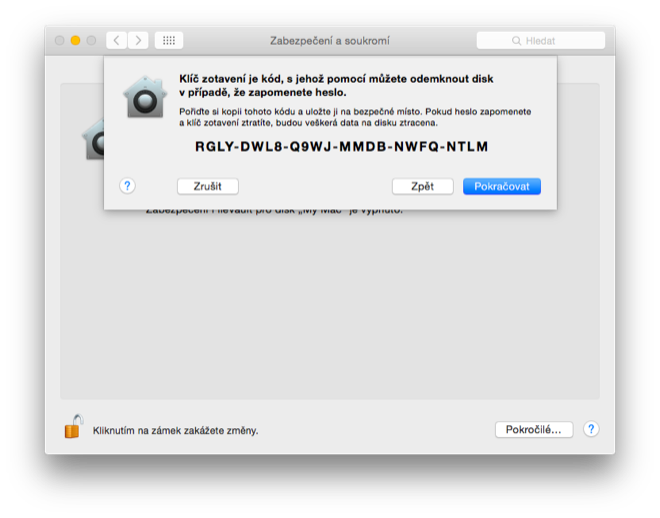 FileVault 2 šifruje celý disk metodou XTS-AES 128, a pomáhá tak udržovat vaše data v bezpečí. Pokud zapomenete své uživatelské heslo, můžete si svůj disk odemknout pomocí iCloud účtu nebo pomocí 24-místného kódu. FileVault nastavíte v Předvolbách systému –> Zabezpečení a soukromí. Dole klikněte na zámeček a zadejte heslo ke svému účtu. Nyní již stačí kliknout na tlačítko Zapnout FileVault… Vyberte si, zda chcete povolit iCloud účtu, aby odemkl váš disk nebo si chcete nechat vygenerovat 24-místný kod. Kód si opiště na papír nebo si ho pošlete například emailem. Rozhodně si kód neukládejte pouze do počítače, jelikož v případě zapomenutého hesla se k němu nedostanete. Budete nuceni restartovat počítač a po jeho opětovném spuštění se začne šifrování nastavovat. Během toho můžete s počítačem plnohodnotně pracovat, můžete ho také vypnout, uspat nebo uzamknout. FileVault by neměl nijak zpomalit váš disk, tudíž by práce na počítače měla být stejně plynulá jako předtím.
