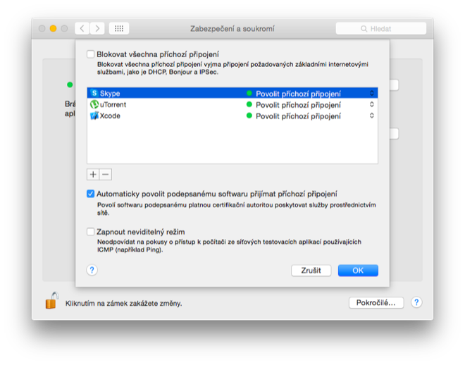 Defaultně není Firewall v Mac OS X Yosemite povolen. Stačí ho tedy zapnout opět v Předvolbách systému –> Zabezpečení a soukromí –> Firewall. Znovu dole odemkněte zámek, který umožní provádět změny. Nahoře kliknětě na Zapnout firewall. Status brány Firewallu se změní na zapnuta. Váš Mac bude od této doby blokovat příchozí připojení od neautorizovaných aplikací, programů a služeb. Pokud si tedy stahujete aplikace z internetu a ne pouze z Mac App Store, tak pro tyto aplikace budou připojení blokována. Některé aplikace z internetu jsou však autorizované. Jedná se například o Skype od Microsoftu, který v Mac App Store není a lze ho pouze stáhnout na oficiálních stránkách Skypu. Blokovat příchozí připojení pro jednotlivé aplikace lze po kliknutí na tlačítko Volby firewallu… Aplikace, kterým chcete zakázat příchozí připojení můžete přídat pomocí tlačítka (+). Můžete zde také zakázat všechna příchozí připojení, což nedoporučuji, jelikož pak nebudete moci používat například AirDrop, sdílenní hudby z iTunes atd.