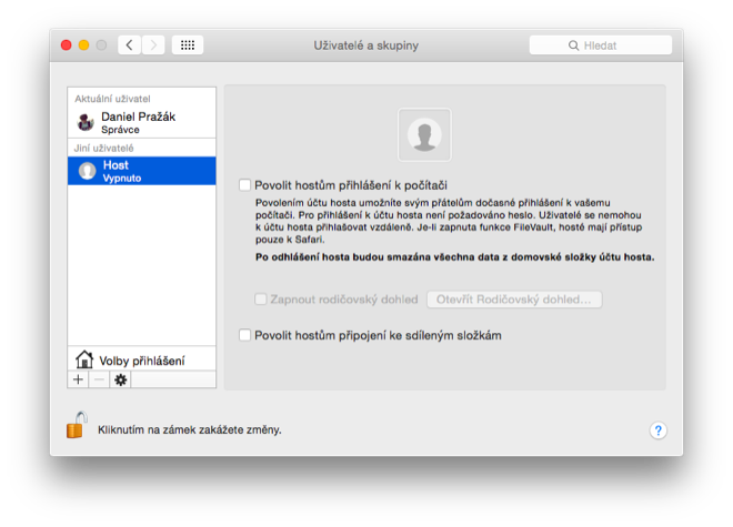 Nejedná se příliš o zabezpečení, ale pokud chcete, aby se na váš Mac nedostal nikdo jiný, než vy, tak je vhodné zakázat uživatele Host, který je automaticky povolen. V Předvolbách systému –> Uživatelé a skupiny klikněte v pravém sloupci na uživatele Host a odškrtněte možnost Povolit hostům přihlášení k počítači.