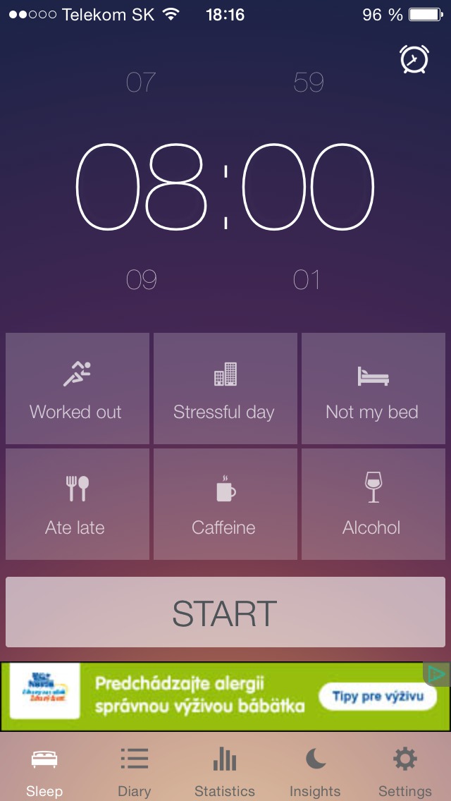 Co je však nejdůležitější, je inteligentní alarm, u kterého si nastavíte čas, ve kterém chcete vzbudit v rozmezí několika minut a alarm vás vzbudí v tomto čase v nejlepší možnou fázi spánku tak, abyste vstali svěží a odpočatí. Stačí, když nastavíte, že chcete vstávat nejdříve v 8:30 a nejpozději v 9:00 a poté se o vše postará inteligentní algoritmus, který vývojáři runtastic vyvinuli na základě měsíců práce v laboratořích, kde společně s lékaři a odborníky na kvalitní spánek vytvořili tuto aplikaci.