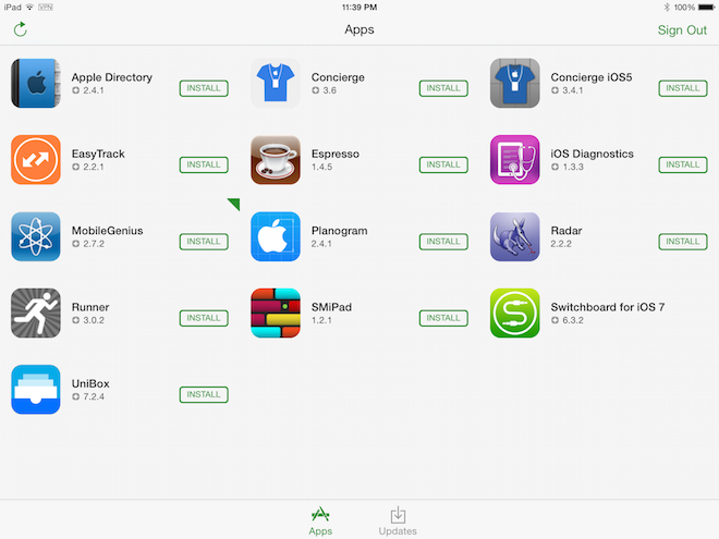 Užívatelia s povolením môžu vstúpiť do SwitchBoardu dvojakým spôsobom. V prvom prípade sa môžu prihlásiť pomocou svojho AppleConnect ID, čiže s e-mailom a heslom, alebo v druhom prípade stačí namiesto hesla pospájať kruhy presne tak ako na Androide. Je však možné, že s príchodom iPhone 5s sa už k prístupu do Switchboardu využíva overenie pomocou odtlačku prsta. Po prihlásení sa má užívateľ možnosť vidieť kompletnú ponuku aplikácií, ktoré potrebuje k svojej činnosti aj s možnosťou aktualizovania týchto interných aplikácií. Presný počet aplikácií v obchode Switchboard sa nedá určiť, nakoľko každý zamestnanec Applu má prístup k iným aplikáciám, ktoré sú vhodné pre jeho obor. Zo softvéru, ktorý sa v tomto obchode nachádza, vyberiem tie najzaujímavejšie.