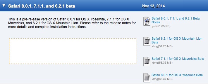 Okrem aktualizácii pre širokú verejnosť dnes Apple rozposlal aj nové aktualizácie Safari pre vývojárov. Špecificky sa jedná o trojicu aktualizácií, kde každá je určená pre jednu konkrétnu verziu systému OS X, no všetky ponúkajú rovnaké zmeny. Aktualizácia Safari 8.0.1 je určená pre OS X Yosemite, aktualizácia Safari 7.1.1 je určená pre OS X 10.9.5 Mavericks a nakoniec aktualizácia Safari 6.2.1 vyžaduje OS X 10.8.5 Mountain Lion. V závislosti od verzie operačného systému sú potom aktualizácie dostupné v sekcii Software Update v Mac App Store, pokiaľ ste prihlásení cez svoj vývojársky účet, alebo cez Apple Developer Center.