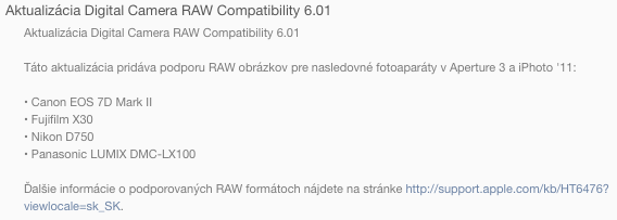 Apple dnes po boku nového Thunderbolt Display Firmware Update 1.2 vydal novú aktualizáciu zabezpečujúcu kompatibilitu s RAW fotografiami zo štyroch nových fotoaparátov. Aktualizácia Digital Camera RAW Compatibility 6.01 zabezpečuje kompatibilitu s RAW fotkami, ktoré boli vytvorené pomocou fotoaparátov Canon EOS 7D Mark II, Fujifilm X30, Nikon D750 a Panasonic LUMIX DMC-LX100. Aktualizácia zabezpečuje kompatibilitu v Aperture 3 a iPhoto 11. Aktualizácia je dostupná zadarmo z Mac App Store.