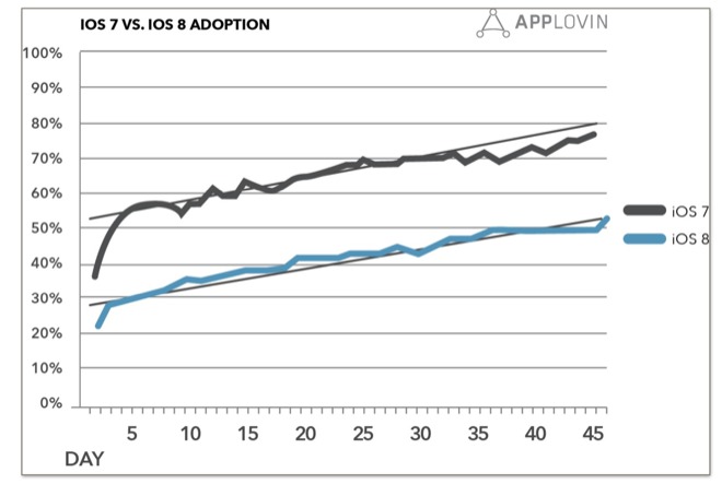 Z grafu, který je zveřejněn níže, lze snadno vyčíst, že jak u iOS 7, tak i u iOS 8 stoupala stahovanost lineárně po dobu celých 45 dní. iOS 8 byl uvolněn 17. září. Graf tedy zobrazuje vývoj do konce října. Během toho 20. října Apple vydal iOS 8.1, který přišel s novinkami jako iCloud Photo Library, Continuity, Handoff a především pak Apple Pay. To pravděpodobně nalákalo spoustu uživatelů, kteří čekali na nové funkce a pak také na to, až bude nový systém více odladěný. Graf však v této fázi stagnuje na hodnotě něco pod 50%. Je tedy zřejmé, že AppLovin dělal statistiku pouze iOS 8 a nezačlenil do statistik také iOS 8.1.