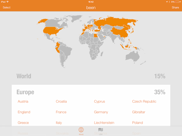 Been je aplikace do které si zadáte, kolik zemí jste na světe naštívili. Stačí kliknout na kontinent, následně na příslušné země a been je označí. Poté vám je všechny ukáže na mapě a efektivně spočítá, v kolika procentech zemí jste již byli. Aplikace je zdarma.