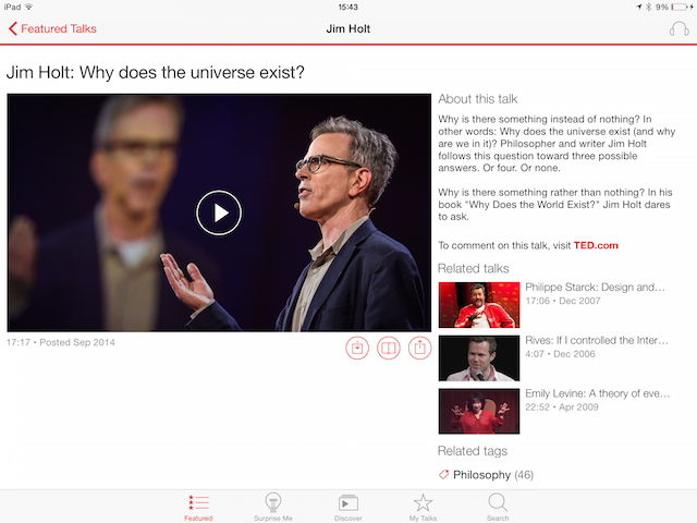 TED (Technology, Entertainment, Design) je globální set konferencí, na které se sejdou chytré hlavy (například Richard Branson, Bill Clinton nebo Al Gore), které přednáší o zajímavých tématech. Aplikace TED nabízí více než 1700 těchto přednášek (další přibývají každý den) zaznamenaných na kvalitním videu. Uživatel má na výběr hledat podle známých osobností nebo podle sekcí, každý si najde něco. Aplikace je zdarma, bez reklam a bez mikrotransakcí.