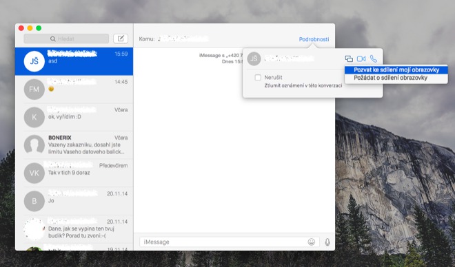 Zprávy v OS X měli až do vydání nové verze systému jen jedinou úlohu a to posílání zpráv přes iMeesage do iPhonu nebo dalšího počítače Mac. S OS X Yosemite však aplikace Zprávy získala nové funkce. Kromě funkce SMS Relay, která umožňuje odesílat a přijímat SMS zprávy také na pomocí Macu, nabízí zmíněná aplikace také funkci, se kterou se Apple ani nestihl pochlubit – přes Zprávy lze totiž sdílet obazovku vašeho Macu s ostatními uživateli, kteří také mají Mac. Samozřejmě je to možné i naopak.