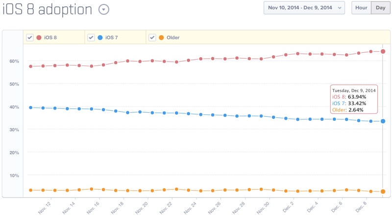 Apple opět aktualizoval svůj přehled o adaptaci iOS 8 a my tak víme, že si iOS 8 nainstalovalo již více než 63% všech iOS zařízení. To znamená, že se po měsíci zvýšil počet instalací z 56% na 63%, což značí, že se iOS 8 instaluje pomaleji než předchozí operační systémy pro iPhone a iPad a v současné době si nový operační systém instaluje pouze 6-7% uživatelů za měsíc. Vzhledem k tomu, že iOS 8 nepřináší žádnou radikální změnu designu nebo něčeho zásadního a celých 96% uživatelů již používá iOS s novým flat designem, je zřejmé že uživatelům v instalaci nejvíce brání obava před možnými chybami nové verze iOS.