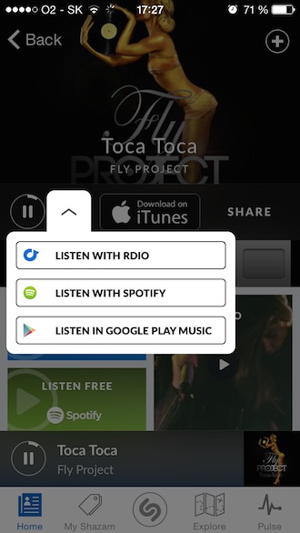 Ďalšou novinkou je prehrávač Shazam Player, ktorý môžete vysunúť tým, že kliknete na obal albumu v spodnej časti obrazovky. V ňom potom máte možnosť vidieť kompletný zoznam skladieb (miniatúry obalov), možnosť pozastaviť, prejsť na ďalšiu alebo predošlú skladbu a možnosť kúpiť si skladbu v iTunes Store. Tlačidlo (+) pre zmenu umožní pridať skladbu do playlistu Spotify, Rdio alebo do sekcie „My Shazam“. A to je ďalšia novinka. Doteraz bolo možné pridávať hudbu do Shazamu len tak, že ste ju identifikovali. Ale po novom si ju môžete pridať priamo z playlistov, ktoré obsahuje Spotify, čo je ďalšia veľká výhoda updatovaného Shazamu.