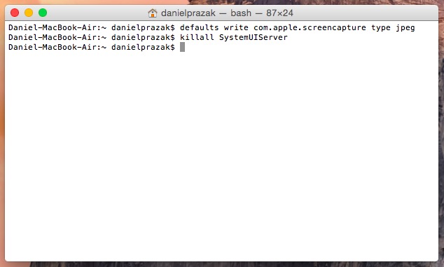 Tím jsme tedy systému řekli, že od této doby má veškeré screenshoty, které pomocí zkratek v OS X pořídíme, ukládat ve formátu JPEG. Aby se změny projevily, musíme se buďto odhlásit a opět přihlásit nebo vložíme následující příkaz a potvrdíme ho enterem: