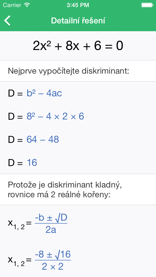 - Řešení kvadratických rovnice (kořeny, diskriminant, faktorizace)