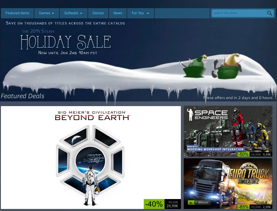 Slová japonského PayPalu sa vyplnili a Valve dnes spustilo Vianočný výpredaj na Steame! Presne tak ako sa vravelo v pôvodnej správe, výpredaj trvá od dnes do 2.1.2015 a dovtedy máme možnosť zaobstarať si množstvo zľavnených titulov pre Mac a na svoje si prídu aj naši čitatelia na Windowse. Medzi zľavnenými hrami sa totiž nachádza aj dnes vydané Metal Gear Solid V: Ground Zeroes pre Windows a to hneď s 33% zľavou, vďaka čomu si hráči za ňu zaplatia len 13,39€ oproti bežným 20€. Okrem toho je pochopiteľne zlacnených množstvo titulov pre Mac, medzi ktoré patrí napríklad Civilization: Beyond Earth so 40% zľavou, teda za 30€.