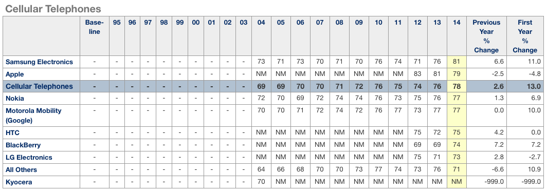 Ten sa zameral mimo iného práve na smartfóny, kde v roku 2014 Apple prišiel o prvenstvo v oblasti spokojnosti a na jeho miesto nastúpil Samsung. Kalifornská spoločnosť zaznamenala pokles spokojnosti zákazníkov o 4,8%, zatiaľ čo Samsung môže oslavovať nárast spokojnosti o rovných 11%. Ale pokles to pre Apple nebol prvý, spokojnosť s iPhonmi klesla aj minulý rok a to o 2,5%, zatiaľ čo u Samsungu narástla o 6,6%. Nedá sa nijak potvrdiť, že by pokles súvisel práve s medializovanými problémami, ale je celkom veľká šanca, že to súvisí práve s nimi.