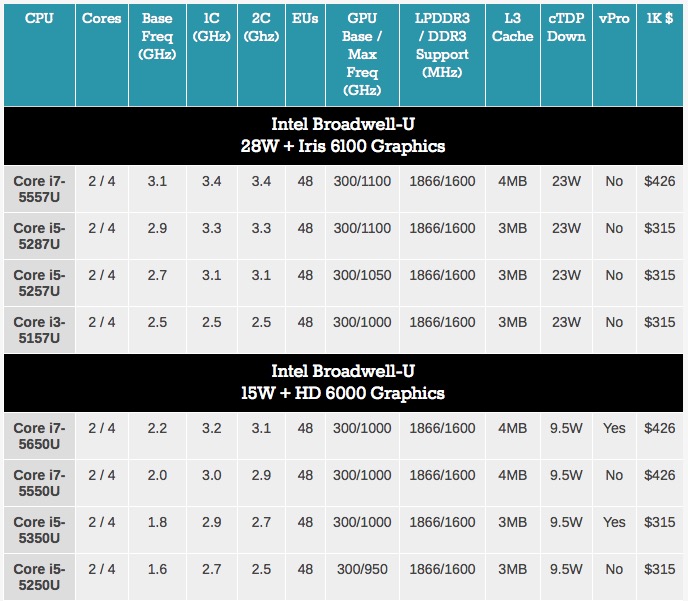 Okrem toho bola uvedená séria procesorov s grafickým čipom Iris 6100 a spotrebou 28 W. Aj tá pozostáva zo štyroch dvojjadrových procesorov, ktorých frekvencia sa pohybuje od 2,5 GHz po 3,1 GHz. Táto séria pozostáva z čipov Core i3 (2.5 GHz), Core i5 (2.7 a 2.9 GHz) a Core i7 (3.1 GHz). Všetky procesory tak ponúkajú o 100 MHz vyššiu frekvenciu, než modely používané v predošlej generácii 13″ MacBooku Pro Retina a dá sa preto čakať, že Apple použije práve tie. Nakoniec, AnandTech získal od Intelu informácie, že prvé počítače s procesormi Broadwell-U sa objavia už koncom mesiaca a je možné, že sa bude jednať práve o nové MacBooky Air. Dodáva tiež, že počítače s grafickými čipmi Iris sa dostanú na trh až koncom štvrťroku.