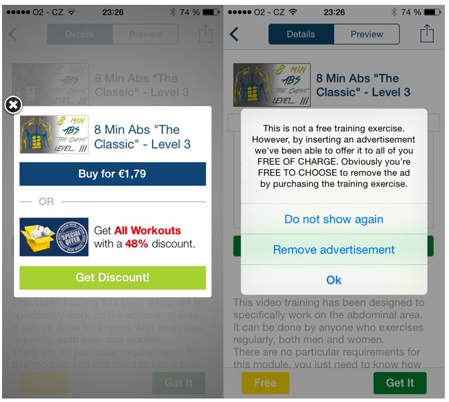 Ovšem lze postoupit na další levely i bez nutnosti cokoli platit. Stačí při vstupu do zvolené sekce zhlédnout krátkou reklamu a pokračovat jako při zaplacení. Pak vás již žádné reklamy obtěžovat nebudou a můžete se plnohodnotně věnovat tréninku. Při opětovné návštevě příslušné sekce budete muset reklamu zhlédnout znovu.