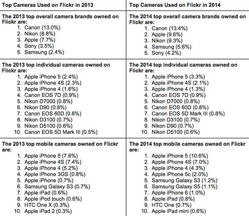 Najobľúbenejším modelom iPhonu mal byť aj minulý rok iPhone 5, ktorý si v zozname obľúbených mobilných zariadení získal prvenstvo s 10,6%. Na ďalších troch miestach sa umiestnil iPhone 4S (7%), iPhone 4 (4,3%) a iPhone 5c (2%). Top 5-ku uzatvára Samsung Galaxy S III s 1,2%. Vzhľadom k tomu, že sa iPhone 6-ka začala predávať až koncom roku, získala podiel 1%. Ale aj to malo pozitívny dopad na podiel iOS zariadení v Top 10-ke mobilných zariadení a Apple si tak ukoristil 7 z 10 pozícií s tým, že 2 patria Samsungom a 1 HTC One. Oproti minulému roku to však predstavuje drobný pokles, tam až 8 z 10 zariadení nieslo nahryznuté jabĺčko na svojom tele. Flickr sa ďalej pochválil tým, že štatistiku vytvoril na základe viac ako 10 miliárd fotiek od vyše 100 miliónov užívateľov, ktoré boli nahrané v priebehu roku 2014.