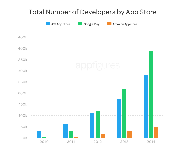Google počet aplikací a her téměř zdvojnásobil oproti roku 2013 a překonal tak i Apple. Největší vzestup však zaznamenal obchod Amazonu, který vzrost meziročně o 90% a nabízí tak 293 000 aplikací. Google taktéž již od roku 2012 zásobuje svými výtvory největší vývojářská komunita. Nejrychleji rostoucí kategorií aplikací v iTunes App Store se stal Business.