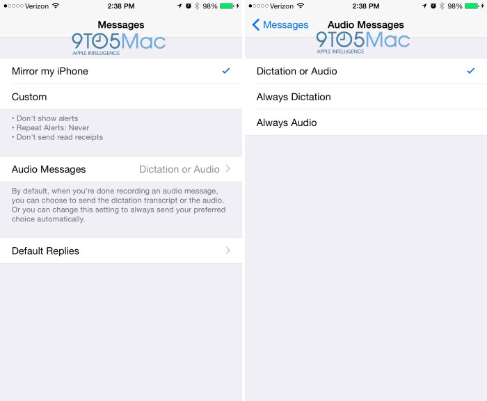 Kvôli rozmerom Apple Watch je celkom pochopiteľné, že sa na ich displeji nenachádza klávesnica. Namiesto toho je možné reagovať na Správy pomocou hlasu, pričom sa tu dá nastaviť, či chcete používať diktovanie alebo chcete rovno posielať hlasové správy, a dokonca je možné spravovať predvolené textové odpovede na prijaté správy. Hodinky tiež umožnia zvoliť si formu odpovedania na správu priamo pri odpovedaní na ňu, pokiaľ chcete raz odpovedať tak a raz inak. Medzi ďalšie novinky týkajúce sa správ patrí možnosť vypnúť potvrdenie o prečítaní správy a možnosť neprijímať upozornenia o správach od ľudí, ktorí nie sú vo vašom zozname kontaktov.