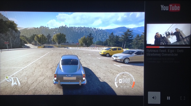 Xbox One má jednu špecifickú funkciu. Kvôli tomu, že bol postavený na Windows 8 (preto to Metro), obsahuje akú-takú formu multitaskingu, konkrétne funkciu Snap. Tá umožní mať otvorené na Xboxe dve aplikácie a tak zatiaľ čo 3/4 obrazovky zaberie hra, zvyšnú štvrtinu prenechá niektorej aplikácii – vrátane YouTube. Po pripnutí YouTube do Snap režimu sa zjaví prostredie veľmi podobné tomu na iPhone, ale s rozdielom, že ho nemôžete ovládať, pokiaľ hráte. Tu si nachádza uplatnenie práve iPhone, pomocou ktorého môžete vyberať videá uprostred hrania, bez toho aby ste museli dávať pauzu. Alebo jednoducho poviete niekomu, aby vyhľadal video a pustil ho za vás. Podmienkou však je, aby bola aplikácia “snapnutá”, bez toho prehrávanie videí na Xboxe nefunguje. Pokiaľ máte TV s pomerom strán 21:9, tak vám to zrejme nebude prekážať tak, ako by vám to mohlo prekážať na 16:9 obrazovke.