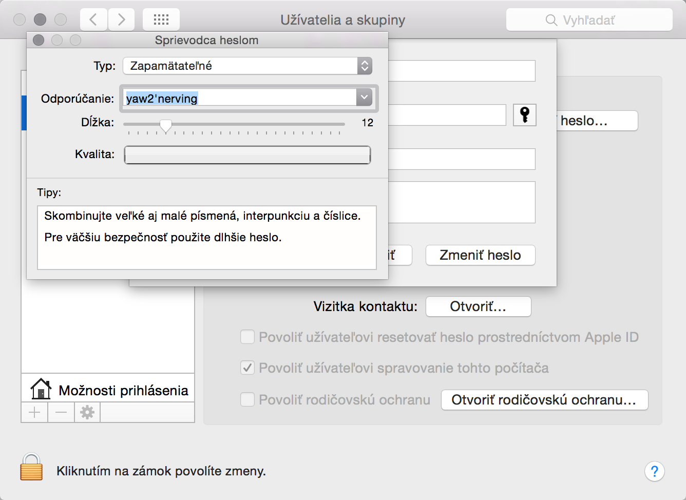 V podstate má každý z vás pravdu, ale! A na to ALE vám dám odpoveď. V prvom rade si povedzme, že iCloud je naozaj dobre zabezpečený no musíte mať dobré heslo. Všetky úniky boli spôsobené zle zabezpečeným heslom. Zatiaľ nebol únik zo služby iCloud Backup ale maximálne z Photostreamu. Kvalitné heslo si vygenerujete aj v prostredí samotného OS X. Pokiaľ pôjdete do Systémové nastavenia -> Užívatelia a skupiny a pri užívateľovi kliknete na položku Zmeniť heslo a tam nájdete tlačidlo so symbolom kľúča. Otvorí sa vám Sprievodca heslom, v ktorom si vygenerujete heslo podľa vašich potrieb ale hlavne také, ktoré len tak nikto neprelomí. Takže z tohto pohľadu by som nemal problém zálohovať do cloudu.