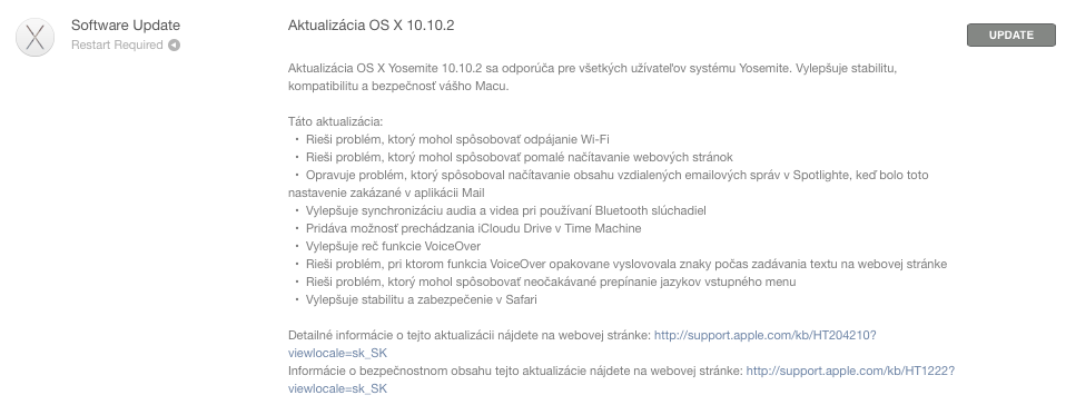 Apple po boku iOS 8.1.3 vydal ďalšiu očakávanú aktualizáciu, OS X 10.10.2 Yosemite. Zároveň sa tak potvrdili špekulácie o jej vydaní, ktoré bolo odhadované práve na začiatok tohto týždňa. Nová aktualizácia OS X 10.10.2 je už tradične dostupná v sekcii Updates v Mac App Store, respektíve na ňu môže systém upozorniť cez vrchnú lištu po kliknutí na logo jablka. Zoznam zmien v novej aktualizácii je totožný s tým, ktorý sme zverejnili včera a tak systém rieši problém s odpájaním Wi-Fi, problém so zdĺhavým načítavaním webových stránok a tiež opravuje nedávno medializovaný problém so Spotlightom, ktorý mu umožňoval načítavať obsah vzdialených e-mailových správ, aj keď si ho užívatelia vypli.