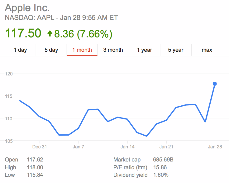 Právě to způsobilo brzy ráno na burze rozruch a Apple se dostal na další rekord, po rekordních výsledcích ze včera stanovil dnes rekordní výsledky hodnotou svých akcií, které se dnes pohybují s cenou těsně pod 118$ za kus a od včerejšího dne tak Apple posílil o téměř 8% na akcii. Akcionáři jsou spokojeni nejen s novými výsledky, ale také s tím, že spekulace okolo nových produktů společnosti Apple posilují a již během následujícího půl roku bychom se měli dočkat iPadu Pro a MacBooku Air 12″.