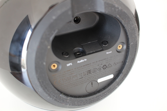 Ve spodní části pak najdeme také dvojici závitů pro uchycení na stojan nebo zeď. V obrácené misce ve spodní části pak nalezneme konektor pro napájení, 3,5mm Jack konektor, tlačítko WPS a tlačítko pro RESET a také servisní konektor. Škoda že chybí Ethernetový port, ne že by Wi-Fi nefungovalo spolehlivě, ale přece jen Ethernet vedený přímo do Airportu Extreme by se jistě hodil.