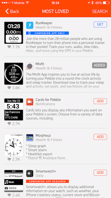 Přijde vám notifikace, můžete ji buď odmítnout pomocí tlačítka na levé straně, které také slouží pro pokyn zpět, nebo se v ní můžete orientovat dolů a nahoru pomocí tlačítek na pravém boku. To ale samozřejmě není všechno, Pebble platforma je na trhu už nějaký ten pátek, a tak se těší poměrně velké oblibě vývojářů. K dostání jsou tedy kromě tuny ciferníků aplikace jako RunKeeper pro snímání uběhnutého času a vzdálenosti (hodinky v sobě mají senzor pro snímání kroků), ESPN pro sportovní zprávy, Evernote, Swarm by Foursquare či různé alternativy, které slouží pro čtení Twitteru nebo kalendáře. Možnosti jsou tedy velké, právě kvůli tomuto faktoru jde o dobrého společníka pro iPhone. Všechny aplikace se stahují přes aplikaci Pebble, která je k dostání v Apple Store.