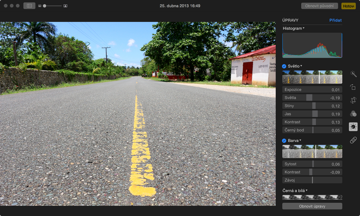 To, co mnohé zajímá asi nejvíce je úprava fotografií ve Photos. Dosavadní uživatelé Aperture jistě zajímá, zda Photos nabízejí i nějakou pokročilejší úpravu. Bohužel neobsahuje a budeme tedy doufat, že Apple nebo nějaký vývojář třetí stran dodá pluginy, které možnosti úpravy fotogrfií rozšíří. V dosavadní verzi je úprava v podstatě identická s úpravou na iOS zařízení. Filtry se jmenují (až na jeden) stejně, není tu ani jeden navíc, vše je skoro stejně rozmístěno a veškeré úpravy se mezi zařízeními synchronizují. Úpravy provedeny v aplikaci Photos je možné vzít zpět na iOS zařízení ihned poté, co se knihovny synchronizují.