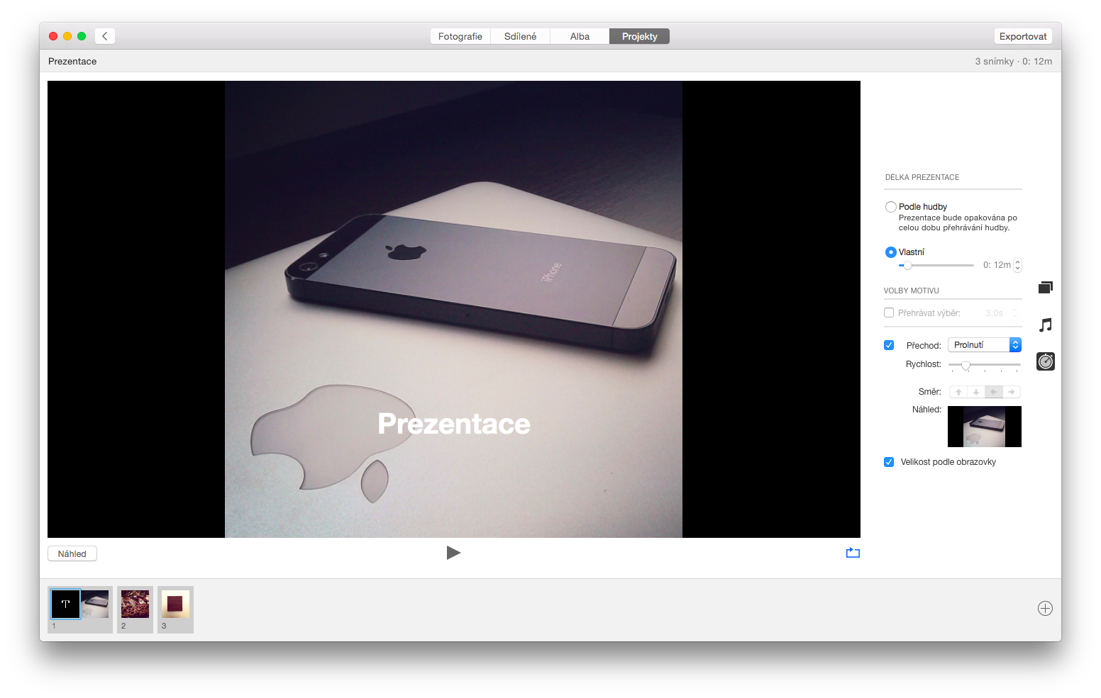 Photos umožňují si z vlastních fotografií vytvořit vcelku příjemné prezentace. Opět jen vyberete fotografie, přidáte příjemnou hudbu z nabídky nebo připojíte vlastní, vyberete motiv a přehráváte. Takto jednoduché prezentace je možné spustit ihned v panelu Alba, kde prezentaci spustíte jediným stisknutím tlačítka. V sekci Projekty je však možné si vytvořit poněkud pokročilejší prezentaci. Zde je, kromě výše zmíněných možností u jednoduché prezentace, možné si přidávat text ke snímkům, styl přechodů, rychlost snímků či délku prezentace, směr odsouvání fotek a další. Celá prezentace se na závěr uloží, tudíž ji budete mít v sekci Projekty kdykoli k dispozici.