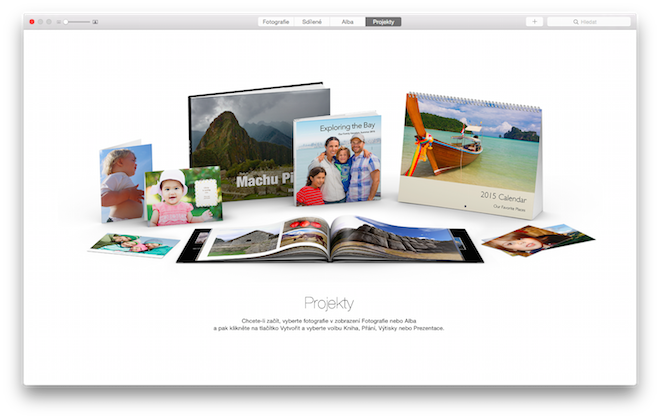 Absolutní novinkou, o které jsme prozatím neslyšeli a není možné jí vidět ani na iCloudu natož v iOS zařízení je tvoření projektů. V podstatě se jedná o to, že si z vlastních fotografí můžete vytvořit knihu, kalendář, přání nebo výtisk fotografie. Veškeré zmíněné služby jsou zpoplatněny a pro Českou republiku nebo Slovensko jsou pravděpodobně nedostupné. Apple tedy opět míří na běžné uživatele, kteří služby, které Photos nabízí, jistě využijí, jelikož je to naprosto jednoduché. Fotografie svých děti, pořízených iPhonem máte sdílené do Photos, naklikáte ty, které chcete, sestavíte si knihu, kalendář nebo přání. Přidáte vlastní text, kterému bude předdefinován správný styl, velikost a umístění a poté jen zaplatíte a dárek pro babičky pod stromeček nebo k narozeninám máte jednoduše hotový.