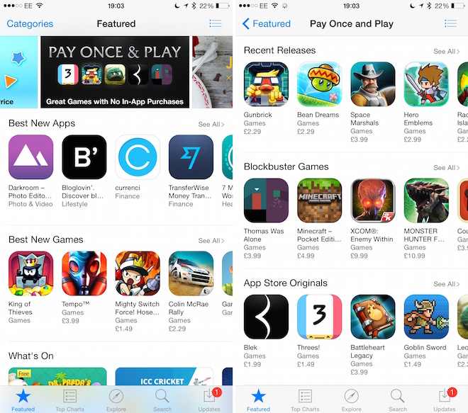 Apple vrámci aktuálnych zmien v App Store otvoril novú sekciu aplikácií, ktoré neobsahujú žiadne ďalšie in-app nákupy a teda za ne Zaplatíte raz a hráte, ako vraví Apple. Spoločnosť tým chce zrejme prezentovať, že nie každá aplikácia v iTunes App Store ukrýva dodatočné nákupy. Apple tiež pred pár mesiacmi potom zmenil tlačidlo „Free“ u bezplatných aplikácií na tlačidlo „Get“, čo vzhľadom k prítomnosti mikrotransakcií v prevažnej väčšine aplikácií dáva zmysel. Označovanie takýchto aplikácií ako „Free“ navyše vyvolávalo nedorozumenia a práve vďaka nim vznikol nechválne známy súdny spor, v ktorom nespokojní, „okradnutí“ rodičia vinili Apple za to, že neinformoval dostatočne o Freemium modeli.